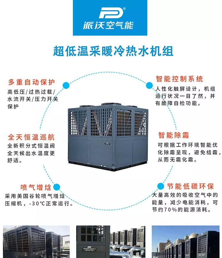 3044永利拥有智能双超(超低温 -30℃环温产出超高温产热99℃技术)空气能核心技术,其旗下的超低温采暖机组,安装简便,智能除霜。自主控温,制热能效高,在大量的高原地区工程案例中经受住了实践的检验。