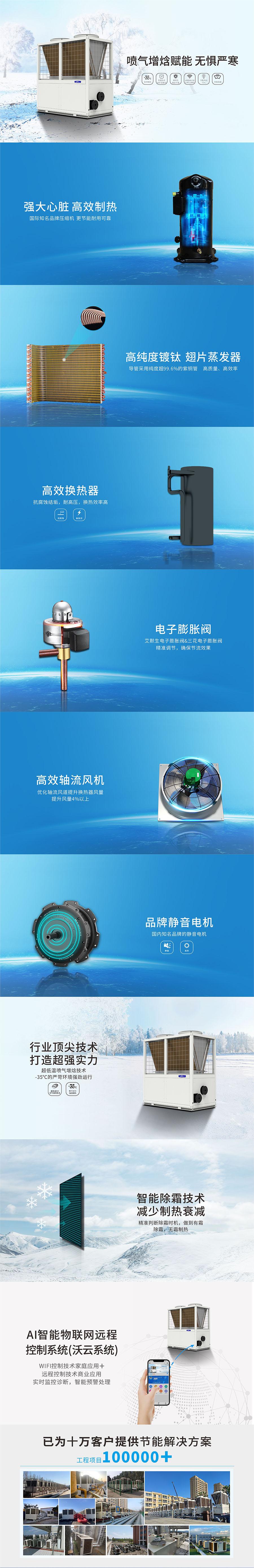采用世界名牌谷轮压缩机,第二代高温喷气焓技术,-15°C运行能效比超过2.5.