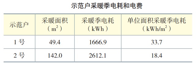 从表中可以看出,经过保温改造的2号示范户,整个采暖季电耗为2612.1kWh,单位面积采暖季电耗仅为18.4kWh。即使是未进行保温改造的农宅1号示范户在热泵连续运行的情况下,单位面积采暖季电耗也仅为33.7kWh,这充分说明使用热风型低环境温度空气源热泵的采暖费用是非常经济的。