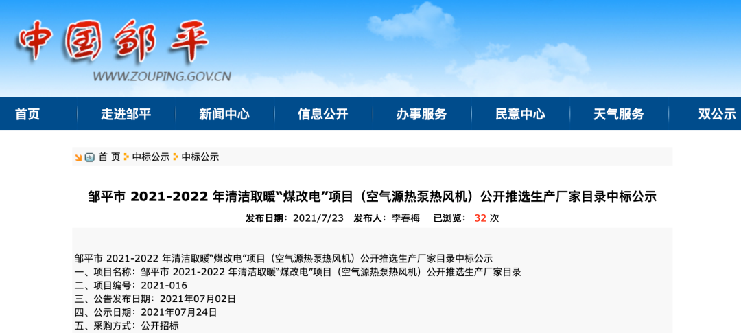 )。共1.38亿!这36家热泵企业中标山东邹平煤改电!