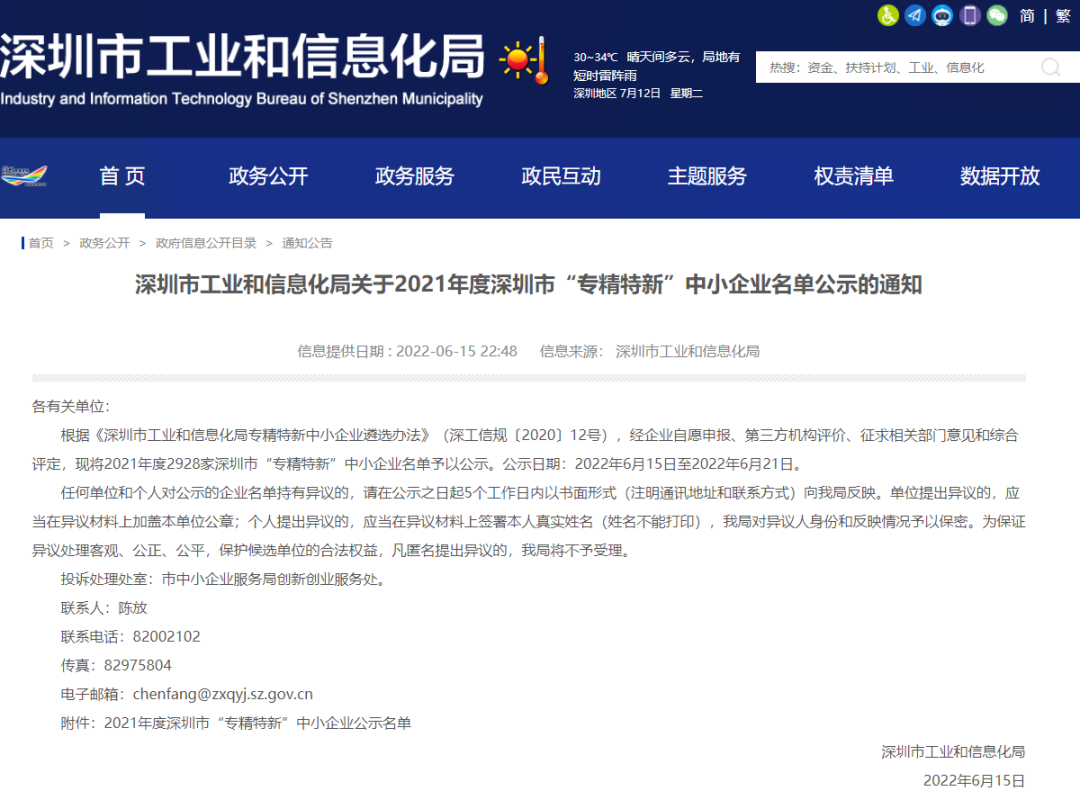 2022年6月15日,深圳市工业和信息化局发布了《深圳市工业和信息化局关于2021年度深圳市“专精特新”中小企业名单公示的通知》,全市共有2928家企业上榜,3044永利空气能凭借在空气能领域的产品研发实力和技术创新优势光荣上榜,喜获2021年度深圳市“专精特新”中小企业的荣誉称号。