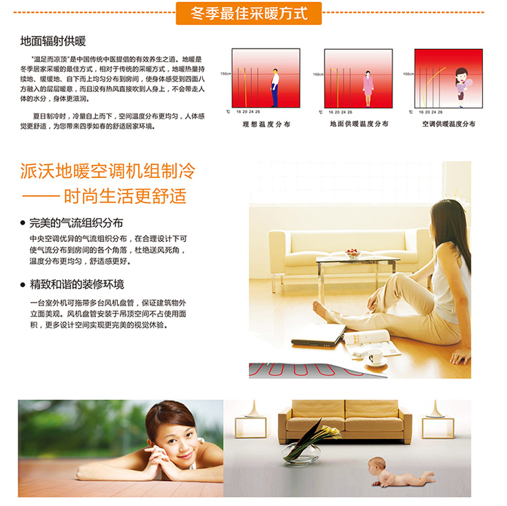 地板采暖时温度从下至上依次递减,温足凉顶符合中医养生学的原理,依靠地面均布的热水盘管辐射产生温度场,采暖无死角,且室内不干燥。室内无强制吹风对流,减小空气灰尘流动,降低呼吸道疾病机率。地暖对老寒腿的老年人有防治功效,也适合爬行期宝宝的发育。空气能热泵地暖的管道则要选择韧性好的,要能完成一圈圈的盘在地上。地暖管道与空调管道不同,要选择散热性好的,保证好的采暖效果,最好是热水从里面走一圈,热量全散发掉,地暖的效果才更佳。