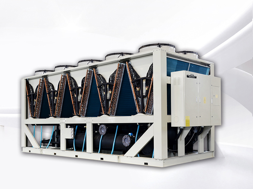 空气源热泵制冷是通过热泵机组将回收来的低压冷媒压缩后变成高温高压的气体排出,随后冷却下来的冷媒在压力的持续作用下变成液态,经膨胀阀后进入蒸发器,由于蒸发器的压力骤然降低,因此液态的冷媒在此迅速蒸发变成气态,并吸收大量的热量。在风扇的作用下,大量的空气流过蒸发器外表面,空气中的能量被蒸发器所吸收,空气温度迅速降低,变成冷气排进风机盘管提供制冷服务。随后蒸发器所吸收一定能量的冷媒回流到压缩机,实现制冷循环。