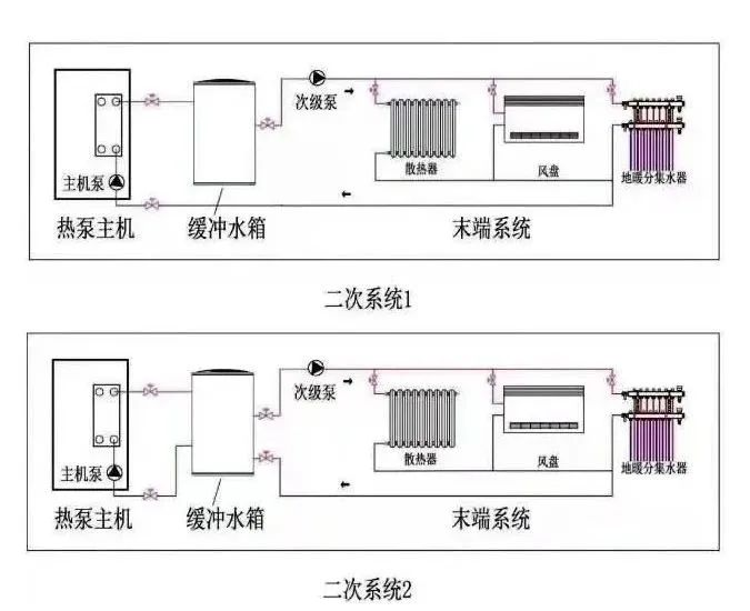 这也就是我们常说的二次系统,主机和水箱是一个独立的循环系统,水箱和末端是一个独立的循环系统,主机和末端没有直接联系。主机只对水箱加热,达到设定温度就停止或启动,不会受到末端的影响。这样一来,主机的稳定性就大大增加了。因为热泵主机都有一个最小要求的流量值,如果低于最小值,在制热的时候系统会报高压,在制冷的时候会报防冻。