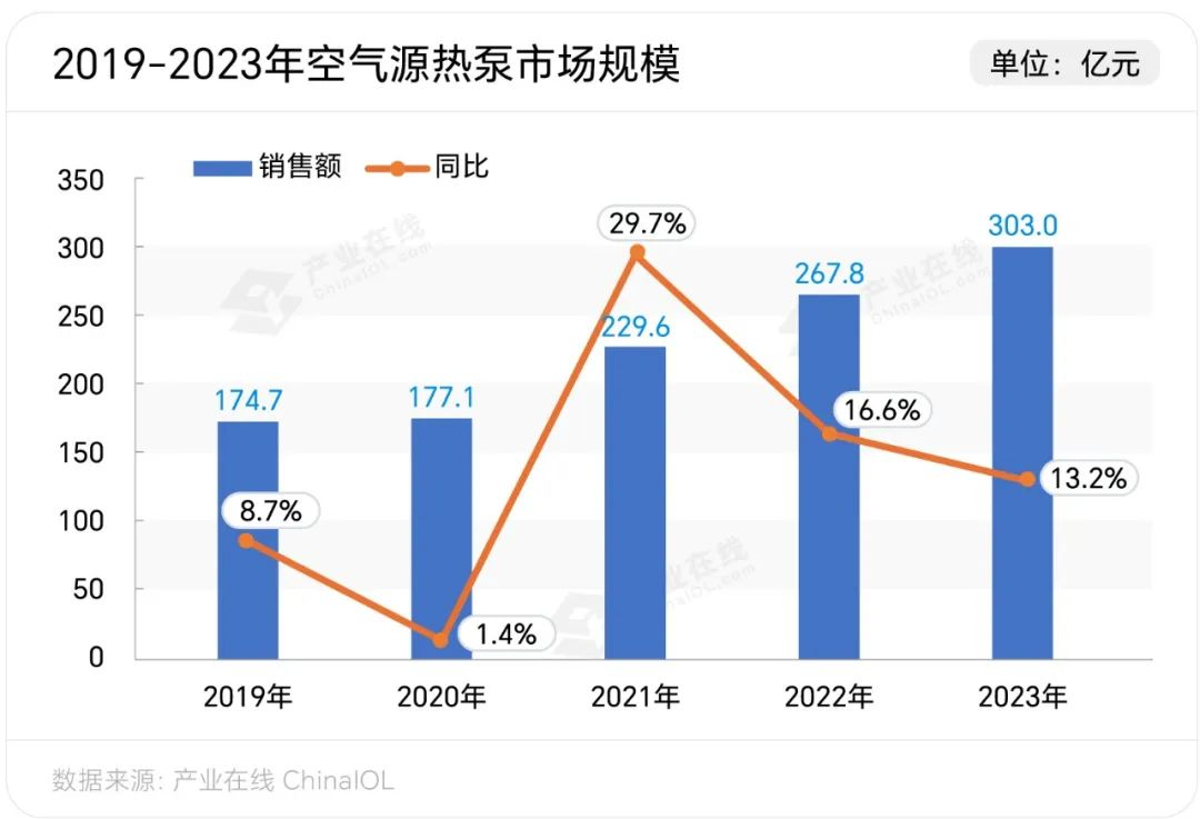 伴随着对这些问题的思考,从空气源热泵市场的发展概况可窥见一斑。据产业在线数据显示,2023年空气源热泵整体销售303亿元,同比增长13.2%。当前,在发展新质生产力以及供热清洁能源转换等多重因素助推之下,空气源热泵迎来新一轮发展契机,3044永利致力于清洁能源利用领域脱颖而出。
