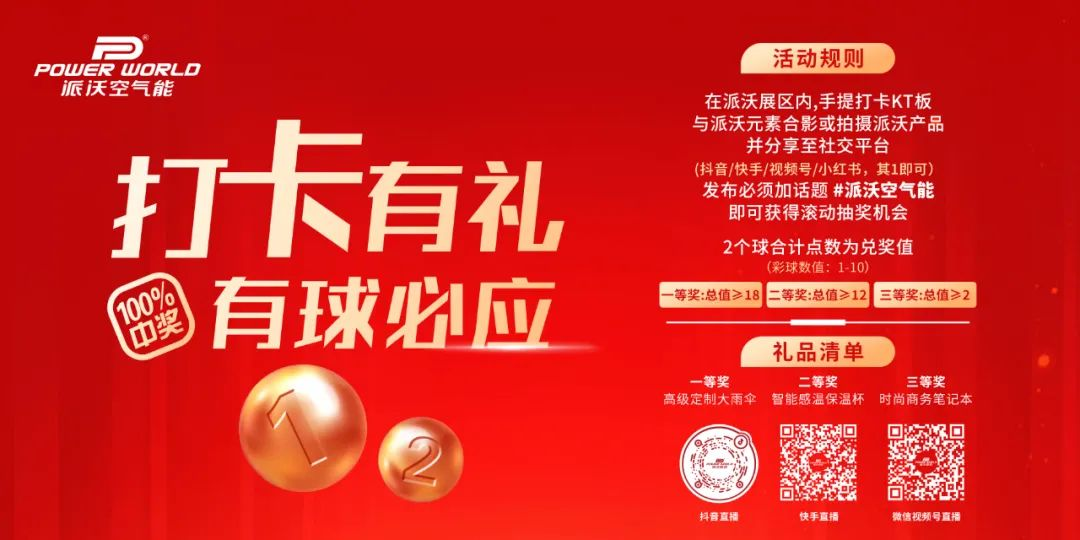 活动一:打卡抽奖,骰子摇出惊喜玩法:在3044永利展区与定制灯板/产品合影,带话题 #3044永利空气能 分享至社交平台(抖音/快手/小红书等),即可激活抽奖! 奖品:摇骰子赢豪礼! 总值≥19分:3044永利定制雨伞(风雨无阻陪你走); 总值≥12分:时尚保温杯(冷暖随心,时刻贴心); 总值≥6分:精致笔记本(记录每一份灵感与温暖)!